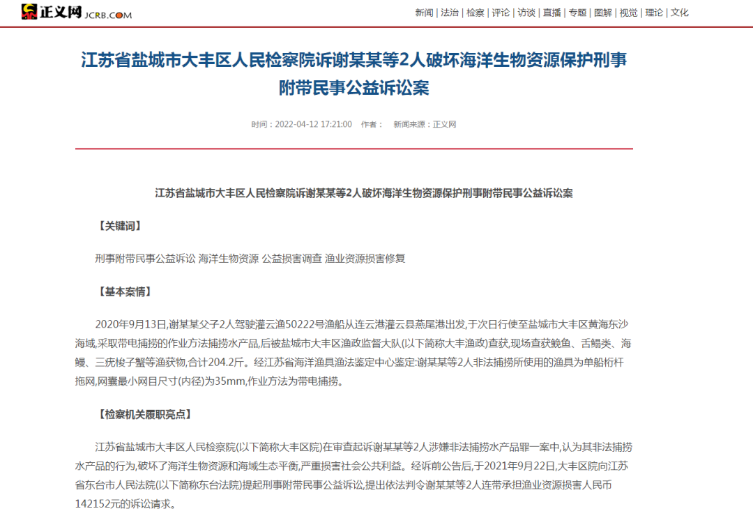 正值第53个世界地球日到来之际,盐城市365bet体育在线滚球_国内在365投注_线上365bet注册区检察院办理的“诉谢某某等2人破坏海洋生物资源保护刑事附带民事公益诉讼案”成功入选了全国检察机关“千案展示”案例。